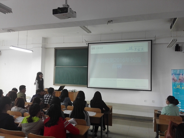 华测公司人事部门经理姜慧向同学们介绍了CTI在中国强势崛起的过程,介绍了青岛分公司的发展历程,同时讲解了企业2016年的招聘待遇,同学生进行了深入交流,解答了学生的相关问题,会后对报名学生进行了面试。