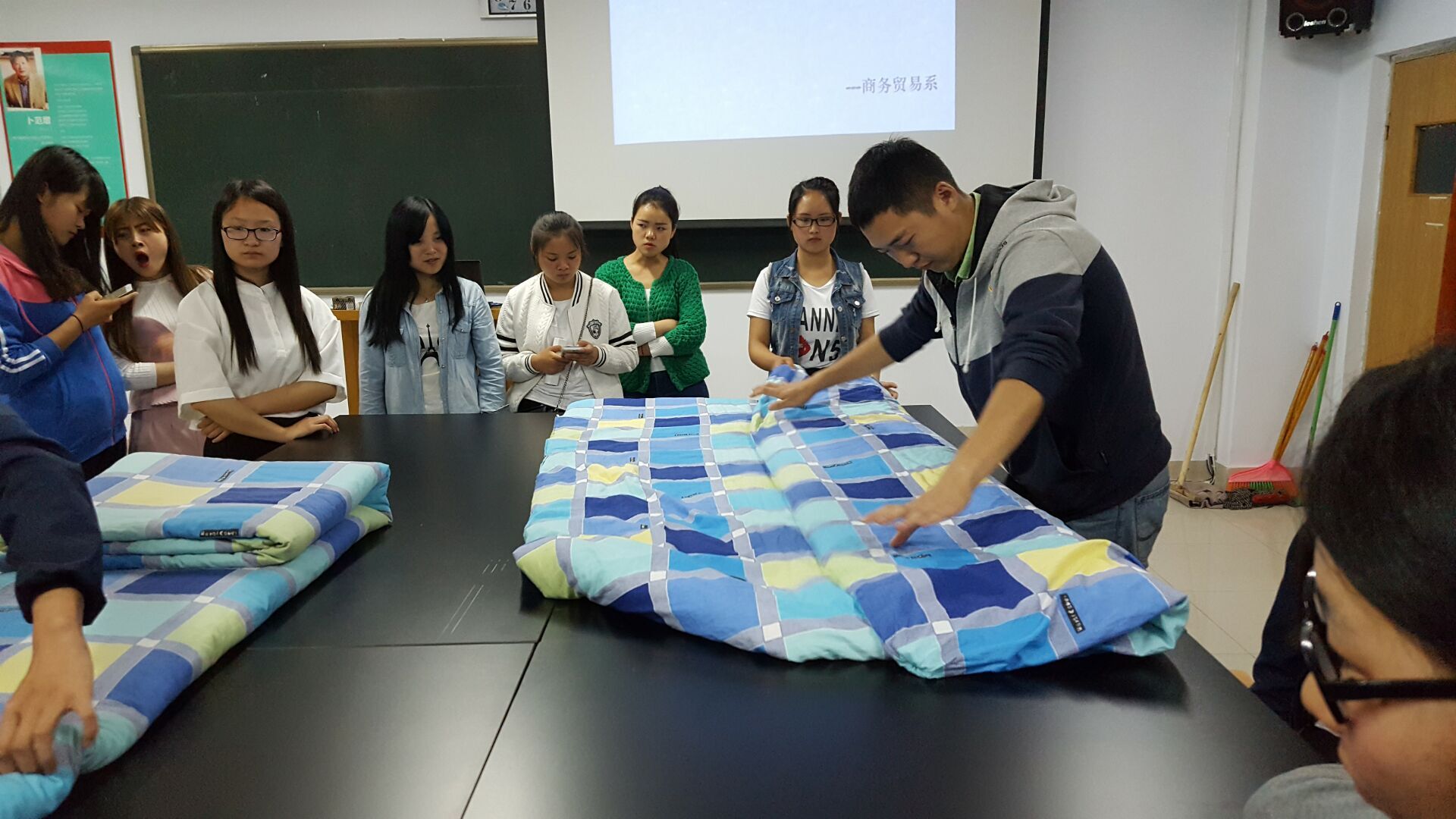 为更好的参与学院即将举办的宿舍内务大赛。5月12日,商务贸易系在J6208举办“叠被子比赛”热身交流会。系部辅导员卢俊、学生会干部及所有参赛同学都参加了本次交流。