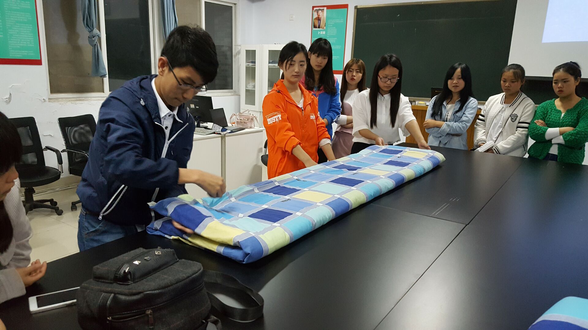 交流会之初,学生会宿管部部长王智向大家介绍了举办本次“叠被子比赛”热身交流会的目的;然后让两名学生代表为大家示范讲解叠被子的正确方法和要领,辅导员卢俊老师进行了引导和分析讲解;最后大家通过观看叠军被的视频,对叠被子的方法进行了进一步的深入学习和总结,圆满完成了本次热身交流会。