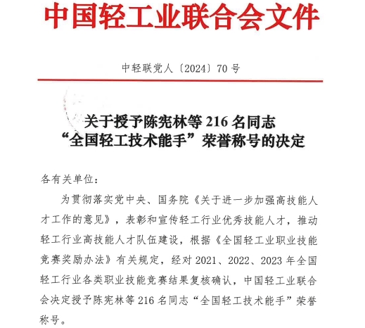 本站讯(通讯员 李根标)近日,中国轻工联合会印发了《关于授予陈宪林等216名同志“全国轻工技术能手”荣誉称号的决定》(中轻联党人〔2024〕70 号),向在2023年举办的全国工业设计职业技能竞赛、全国工艺美术行业职业技能竞赛、全国仿真职业技能竞赛、全国工业新技术创新应用职业技能竞赛等十七个赛项中取得优异成绩的选手授予“全国轻工技术能手”称号,我校机电工程系李根标、周莉两位教师喜获殊荣。