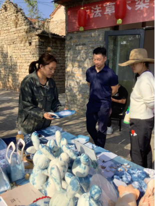 活动中,实践队员们向村民和游客展示了古法草木染技艺这一独特的非遗技艺,展示了扎染玩偶、围巾、手机包、发圈、胸针、团扇等十多种非遗文创产品。