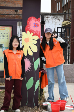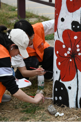 此次活动以“画笔绘阳光,心语暖小巷”为主题,艺术学子们以墙绘为媒介,对社区老旧墙面进行了艺术改造。他们身着橙色马甲,手持画笔和颜料,从电线杆到墙面,从细微处到整体布局,每一处细节都精心勾勒。在他们的巧手下,鲜艳的花朵、灵动的卡通形象、宁静的青山绿植等图案跃然于墙上,原本单调的社区设施瞬间披上了“艺术外衣”。