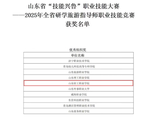 本站讯(通讯员 陈贻韬)11月7日,山东省“技能兴鲁”职业技能大赛——2025年全省研学旅游指导师职业技能竞赛决赛获奖名单正式揭晓。我校工商管理系参赛师生凭借出色表现获职工组一等奖1项、二等奖1项,学生组优秀奖2项,学校同时获评优秀组织奖。