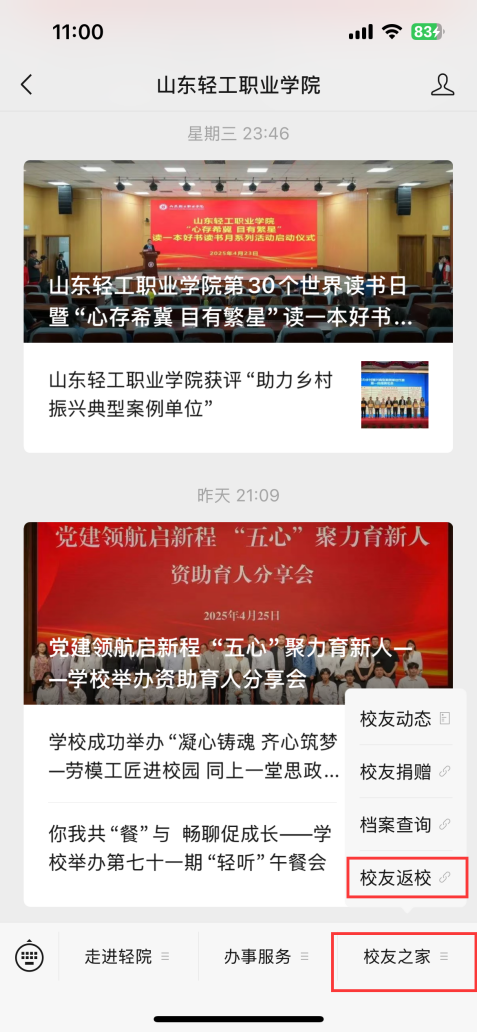 第二步:点击发送消息后进入微信公众号页面,点击校友之家栏目中的校友返校。
