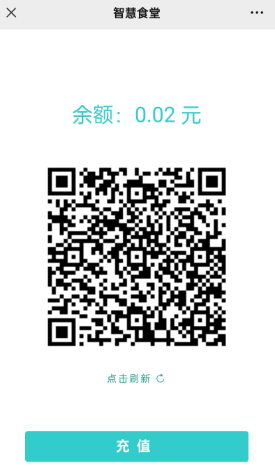 第三步:注册成功后进入详情页面,此页面展示当前账户余额与消费二维码,二维码用于在卡机进行消费。如果二维码过期,可点击下方“点击刷新”按钮,刷新二维码。首次进入此页面,账户余额为0,可点击“充值”按钮进行充值。充值见步骤四。注册成功的用户再次扫描步骤一的二维码会直接进入下方页面。