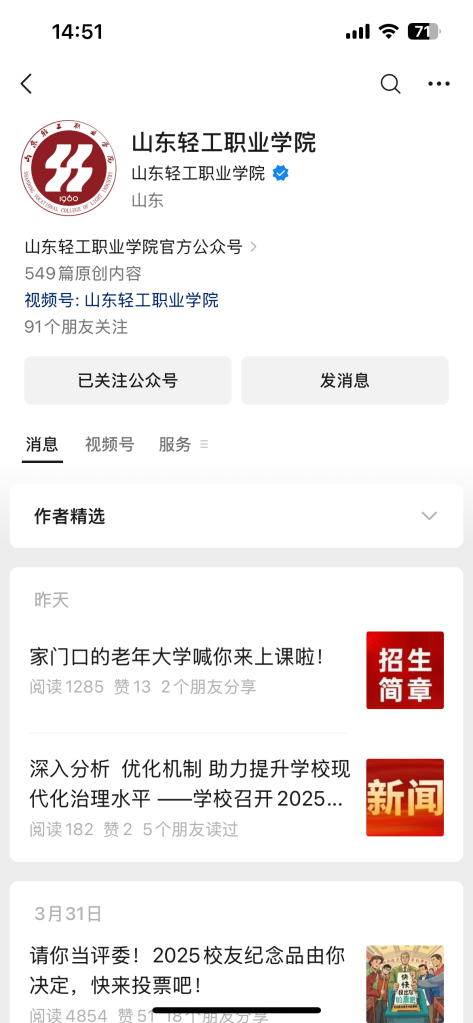 第一步:关注山东轻工职业学院微信公众号。